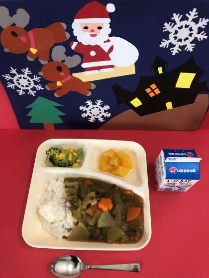 冬野菜のカレーライスは、子どもたちに人気のカレーライスに、冬が旬のだいこん、れんこんなどを使用しています。給食室で花形に切り抜いたラッキーにんじんが入っています。