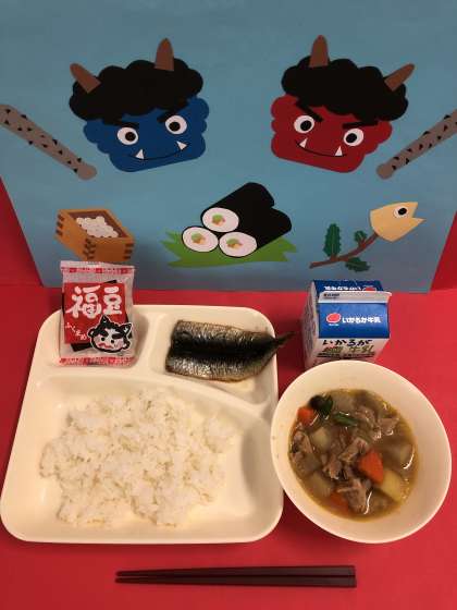 今日の給食では、節分の行事献立として「いわしのしょうがじょうゆかけ」と「いり大豆」が登場します。