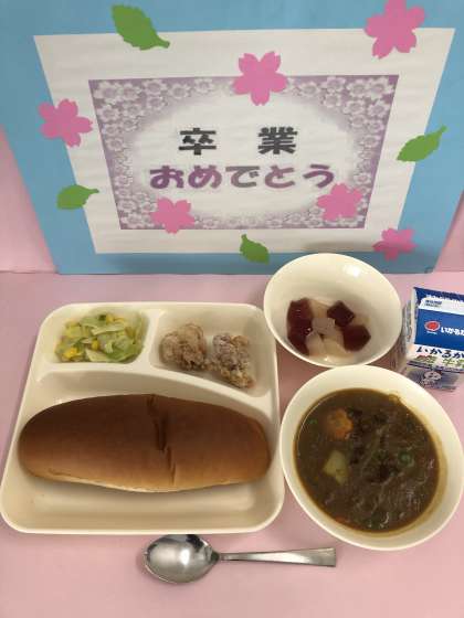 卒業祝い献立には、6年生の卒業をお祝いする気持ちがこめられています。フライドチキンは、給食で子どもたちが大好きな鶏肉のからあげに、オールスパイスを使用して洋風にアレンジしています。