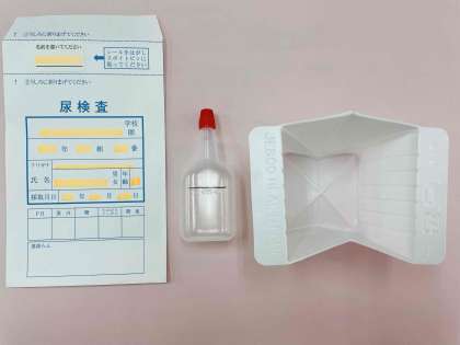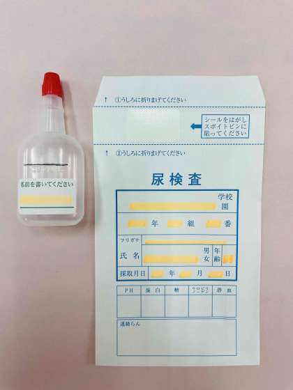 本日、検尿のキット(3点)と検尿についてのほけんだよりを配布しました。(写真上)