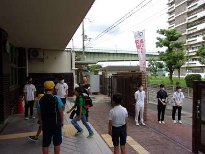 今月のあいさつ運動の担当は5年生です。代表委員会児童、実習生と一緒に門に立ってあいさつをしました。登校してきた児童もしっかりとあいさつを返していました。