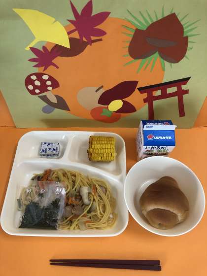 ウインナーときのこの和風スパゲッティは、ウインナー、ベーコンを主材に、季節の食材のしいたけ、しめじのほか、たまねぎ、にんじん、ピーマンを使用し、しょうゆベースの和風の味つけにしています。喫食時にきざみのりをかけて食べます。