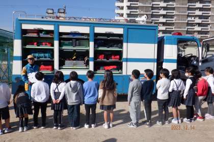 昨日昨日、3年生は住之江警察の方にお越しいただき、災害時の警察のお仕事や避難の仕方について学習しました。災害時に出動するレスキュー車に乗せてもらったり、機動隊の方の話を聞いたりすることで、災害時に働いてくれている検察官の方の仕事について、興味深く学習することができました。