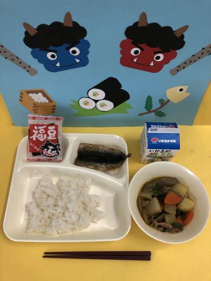 節分の日には、病気や悪い出来事を追いはらうため、「鬼は外、福は内」と言って豆まきをしたり、年の数だけいり大豆を食べたりする風習があります。給食では、節分の行事献立としていわしのしょうがじょうゆかけといり大豆が出ます。