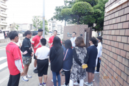 6月4日、児童会の子ども達を中心にあいさつ運動をしました。今回のあいさつ運動には、藤井秀明区長、住之江区役所の方々、住之江区にホームグランドがあるラグビーチーム「レッドハリケーンズ」の方々、地域の方々にも参加していただきました。子ども達とラグビーや万博についてもお話をしたいただきました。子どもたちは、ラグビーや万博に興味津々でした。