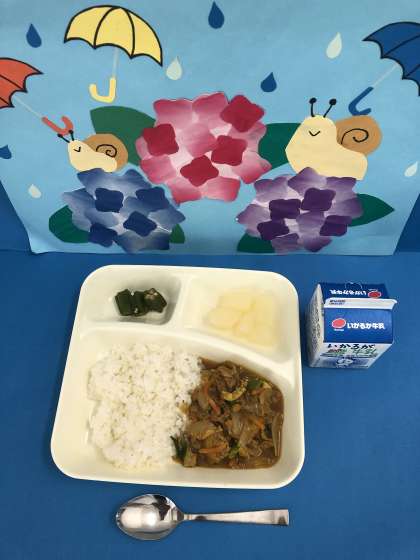 和風カレー丼は、だしこんぶとけずりぶしのだしの風味をきかせた和風のカレーをかけて食べる、子どもたちに好評な献立です。