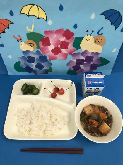 さくらんぼは、初夏のおとずれを感じることができる果物で、6月〜7月ごろにたくさんとれます。日本でとれるさくらんぼは、主に山形県で作っています。給食では1年に1回、生のさくらんぼが6月に登場します。