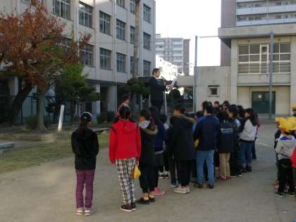 前日に行われた住之江区子ども文化祭で頑張った子ども会の児童約50名が、表彰されました。朝礼台前にでてきて、校長先生から賞状を受け取りました。児童みんな喜んでいました。みんなから盛大な拍手を受けました。