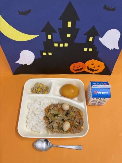 中華丼は、豚肉、うずら卵を主材に、はくさい、たまねぎ、たけのこ、にんじん、しいたけ、青みににらを使用しています。この献立は、【卵】の除去食です。