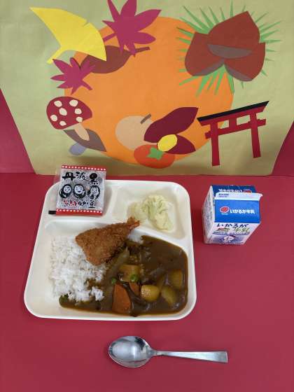 えびフライカレーライスは、牛肉を主材としたカレーライスに、1人1尾のえびフライを添えます。給食室で花形にきりぬいたラッキーにんじんが入っています。