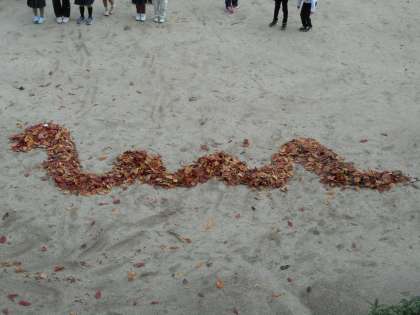生活科で落ち葉アートをしました。赤く色づいたサクラの葉を使って、来年の干支のヘビを作りました。
