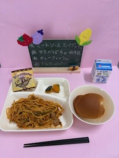 ミートスパゲッティは、牛ひき肉、豚ひき肉を使い、上新粉でとろみをつけて仕上げます。毎回、児童生徒に好評な献立です。
