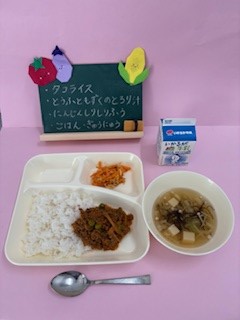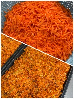 給食では、細切りにしたにんじん、ささみ、かつおぶしと調味料を混ぜ合わせ、焼き物機で焼きます。卵は使っていません。