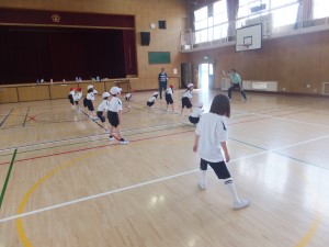 準備体操では、「体のどの部分が伸びているか」確認を