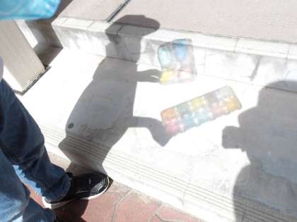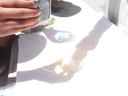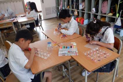透明な容器に色を塗った後、光にかざしてどんな形や色に見えるか見つけました。