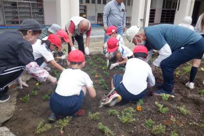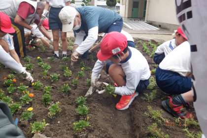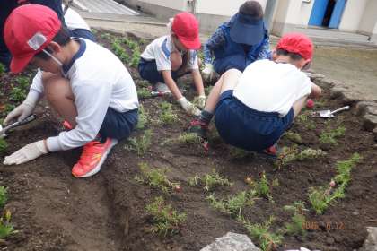 6月12日、住之江区花ボラの会の方々に来ていただき、3年生の子どもたちと一緒に花の苗を植えていただきました。3年生の子どもたちは、百日草、松葉牡丹、マリーゴールドの苗をきれいに並べ、きれいな花が咲くのを楽しみにしていました。