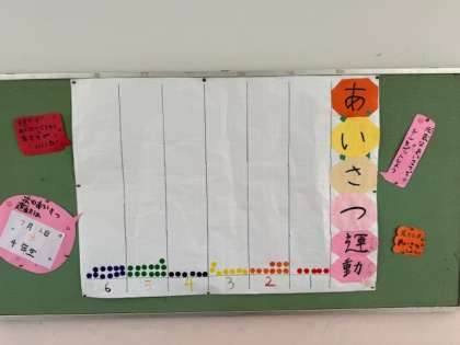 8時10分から8時25分の間に登校し、門に立っている人にあいさつをします。あいさつができれば代表委員がシールを渡します。そのシールを学年ごとに貼ってもらいました。