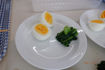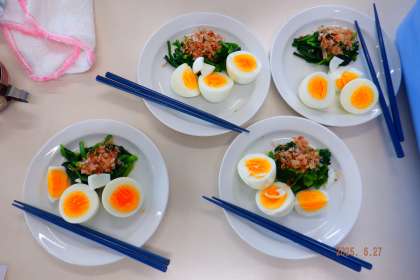 ゆで卵も青菜も包丁で切り、盛り付けを行いました。