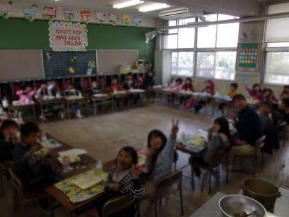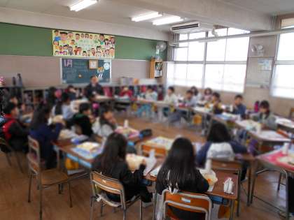 普段はいっしょに給食を食べることがない教職員が教室に来るとものすごい歓迎を受けていました。