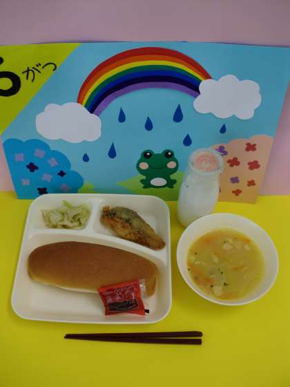 コーンスープは、スイートコーン(クリーム缶)を使用し、ベーコンでうまみを出し、たまねぎ、にんじん、じゃがいも、パセリで彩りよく仕上げています。