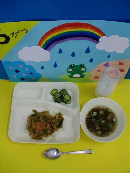 もずくは、日本全国の沿岸で冬から春にかけて成育する、細い糸状の海藻です。旬は4月〜6月で、夏になると枯れてしまいます。給食では、沖縄県でとれたもずくを使用しています。もずくと、他の食材のオクラやえのきたけからもとろみが出るため、汁にとろみがつきます。