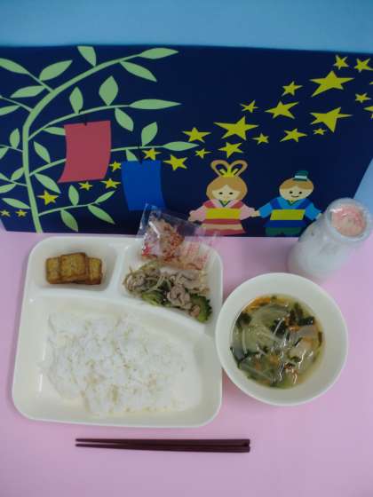 夏が旬のゴーヤ(にがうり)を豚肉ともやしと炒めています。かつおぶしを加えることで、にがうりの苦味を和らげるようにしています。にがうりは、ビタミンCの他、カリウムやカルシウム、マグネシウムなども豊富で、食欲増進など夏バテを予防する働きがあります。にがうりは給食では年1回の登場です。