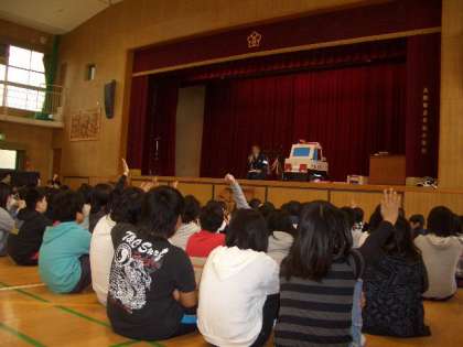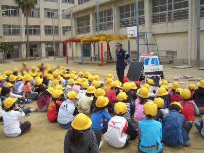 4月16日(水)の2限目、3限目に交通安全教室が開かれました。住之江警察署の警察官が児童に正しい横断歩道のわたり方や自転車や車についての注意をしてくれました。児童の皆さんは真剣なまなざしで聞いていました。