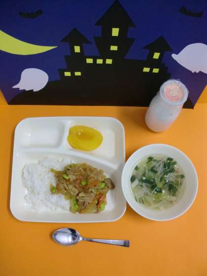ピリ辛丼は、豚肉を主材に、たまねぎ、にんじん、彩りにむき枝豆が入り、トウバンジャンで辛みがついた丼です。