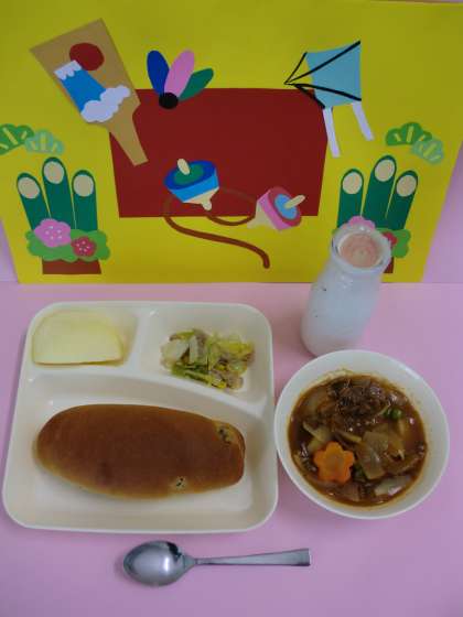 ビーフシチューは、牛肉を主材とし、ブラウンルウで煮こみます。毎回好評な献立です。ルウは小麦粉とサラダ油で作ります。今日のビーフシチューには、給食室で花形に切り抜いたラッキーにんじんが入っています。