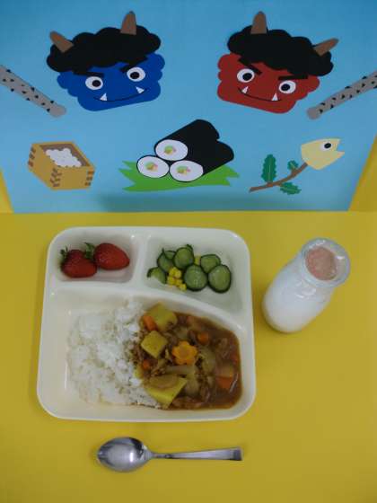 ポークカレーライスは、子どもたちに人気のある献立のひとつです。豚肉を主材に、にんにくを香りよくいため、風味を増しています。給食室で花形に切り抜いたラッキーにんじんが入っています。