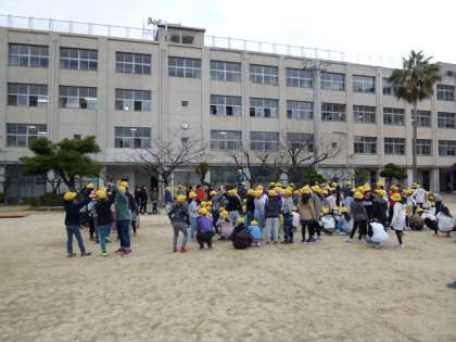 雨が心配されましたが、予定通り運動場で児童集会を実施しました。