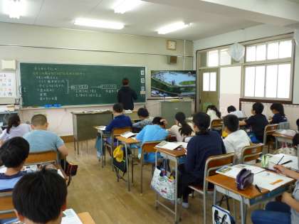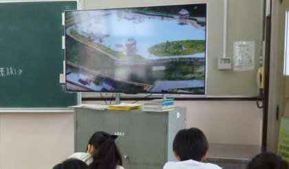 社会科の歴史の学習では、むかしの人々の暮らしを大型モニターに映し、クラス全体で気づいたことや工夫しているところを考えています。