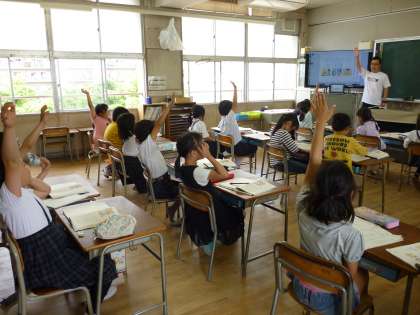 3年生の国語では、こそあどことばを学習しています。教科書を大型モニターに映してどのことばがふさわしいかみんなで考えています。