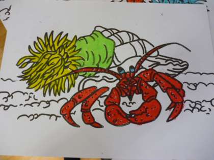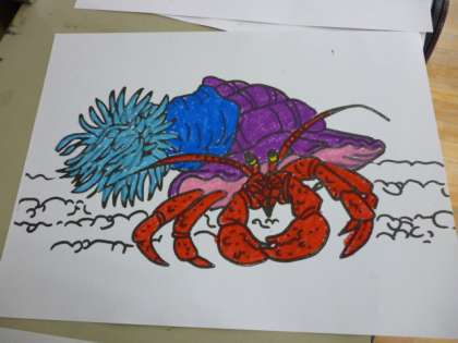 4年生では国語科で学習している「やどかりといそぎんちゃく」と関連させ、図工で「やどかり」の色付けについて技法を工夫しながら進めています。