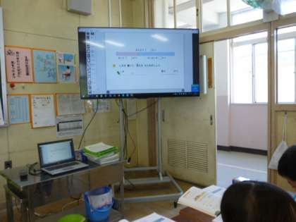 2年生の算数では今日の課題を大型テレビに映し、課題をみんなで共有しながら学習しています。