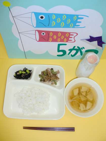 五目汁は、いろいろな食材を使用した汁ものです。今日は、かまぼこを主材に、キャベツ、たまねぎ、にんじん、もやしなどが入っています。