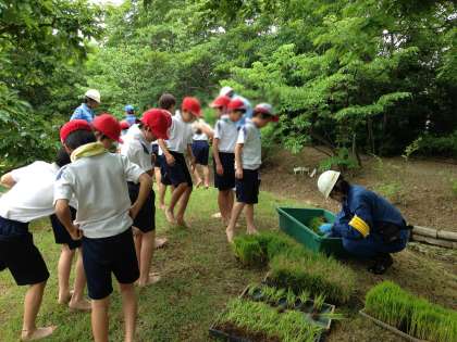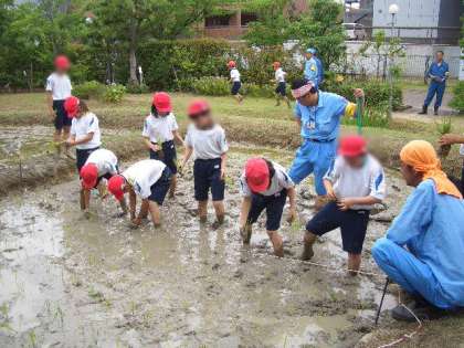 6月6日(金)に5年生は、住之江の抽水場の中にあるせせらぎの里で「田植えの体験」をしました。係りの方から苗をもらい、湿った土の中に裸足になった足を入れて苗を植えていました。秋にお米になるのを楽しみにしています。