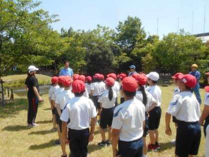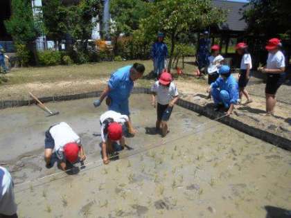 はじめて田植えをする子が多く、水田に入ってその感触に驚いたり、気持ちいいと感想をもらしたりしました。