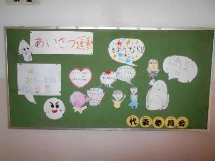 児童会があいさつ週間を盛り上げるために掲示板をデコレーションしました。