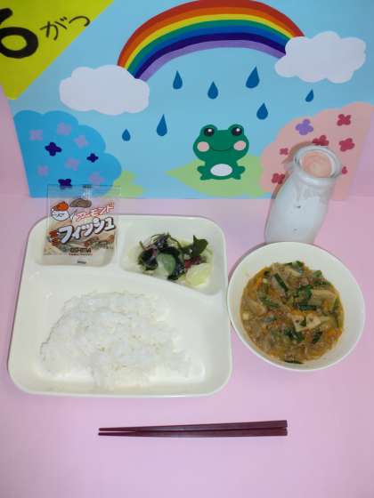 マーボーはるさめは牛挽肉、豚挽肉、はるさめを主材ににんじん、たけのこ等を使用し、トウバンジャンで少し辛味をきかせた味つけにしています。子どもたちに好評な、ご飯がすすむ献立です。
