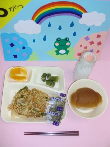 焼きそばは、豚肉、いかを主材に使用したソース味の焼きそばです。食べる時にきざみのりをかけます。