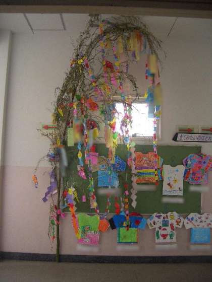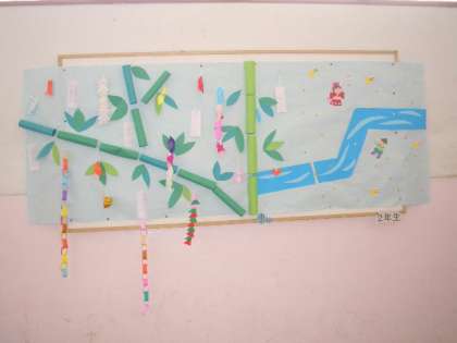 7月7日は七夕です。1年生が先週、願い事を書いた短冊を笹につけ、2階の廊下に飾っています。2年生も1階と2階の階段の踊り場に画用紙で作った笹と短冊が飾ってあります。1年生も2年生も願い事がかなうといいですね。