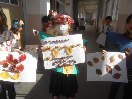 12月4日(火)に1年生が木の葉を使って服を作ったり、画用紙に張り付けて模様を作ったりしました。
