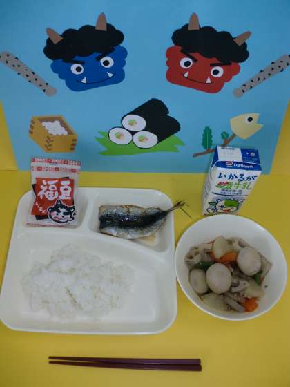 節分の行事献立です。節分にちなんで、いわしやいり大豆が登場します。これに、だいこん等の野菜を使った和風の煮ものを組み合わせています。