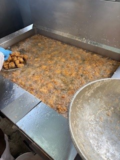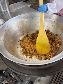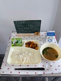 給食の酢豚は、豚肉の他に、たまねぎ、にんじん、たけのこ、ピーマンをを使っています。ケチャップや米酢などで味付けをしています。