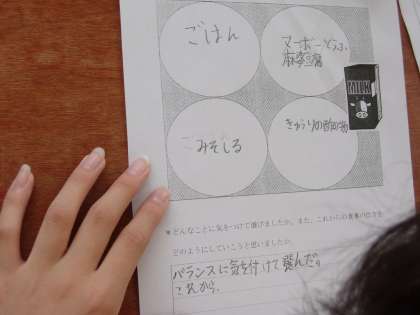 さらに、主食、主菜や副菜、それぞれの数などを学習し、一人ずつそれに対応した食べ物を選び、最終的に「栄養のバランスがとれた給食メニュー」を考えることができました。