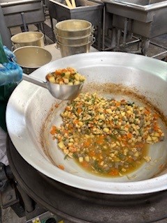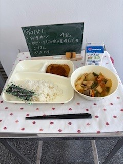 「じゃがいもと野菜の煮もの」は、鶏肉、じゃがいも、こんにゃく、たまねぎ、たけのこ、にんじん青みにさんどまめを使用した煮ものです。