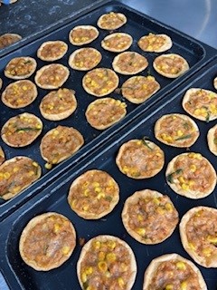 「変わりピザ」は、ツナ、コーン、ピーマン、ピザソース、乳なしチーズを混ぜ合わせて、ぎょうざの皮にのせ、焼き物機で焼きます。児童生徒に好評な献立です。