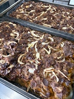 「牛肉の甘辛焼き」は、牛肉にしょうが汁、砂糖、塩、こいくちしょうゆ、綿実油で下味をつけ、たまねぎを混ぜ合わせ、焼き物機で焼きます。