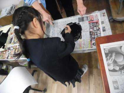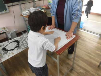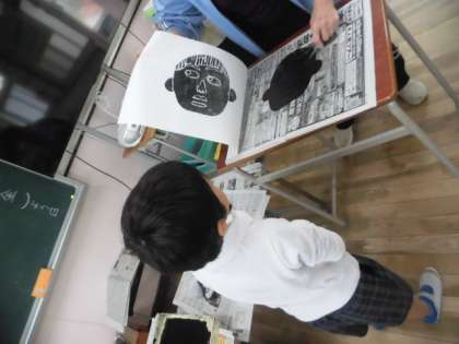 自分の顔の版を画用紙で作り、黒のインクをローラーにつけて、何度もコロコロしました。その後、ずれないように和紙を置いたり、ムラがでないように和紙を抑えたりして、手で一生懸命に刷りました。。刷り上がった作品を見て、どの子もうれしそうな表情をしていました。